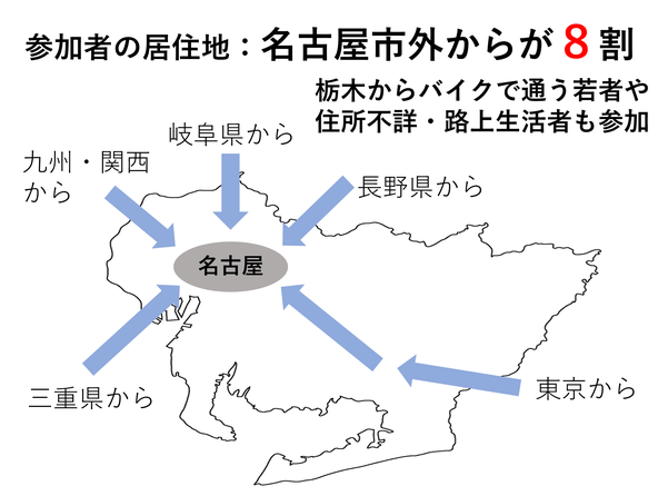 声かけと交流の拠点は、名古屋市内で行っていますが、参加者の約8割は名古屋市外からの参加者です。たとえば三重県や岐阜県、栃木県から通う若者、神奈川県や北海道から転居してきた若者もいます。広域連携が難しい福祉分野において、全国こども福祉センターの交流拠点は、様々な地域の子ども若者に利用されています。